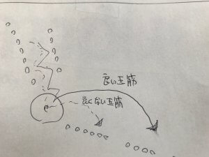 これも先の風車への絡み方同様、毎度同じ玉の飛び方はしないのですが、距離の長短の振り分けで見る。ぶっちゃけ、遠くまで跳ねた玉(良い玉)を基準にするのがいいでしょう。