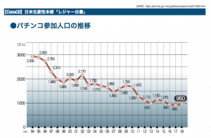 なお、レジャー白書における参加人口は、 厳密に言えば「パチンコファン」の数ではないことに注意したい。レジャー白書における 調査は海外旅行などの大型レジャーと、ウォーキングや庭いじりといった日常的な余暇の過ごし方を並列に扱い、1年間で当該活動を何回行ったかを尋ねている。そのため、日常的な娯楽に近いパチンコを、年に1回だけ行った人も「参加人口」としてカウントされる。
