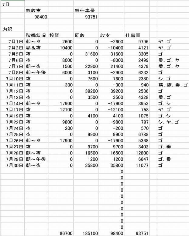 収支表をご覧頂ければと存じますが7月は稼働日数が更に増え、月の3/4を占める21日間へ。
