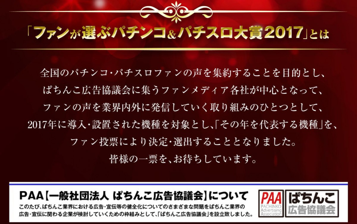 一般社団法人ぱちんこ広告協議会(大島克俊理事長)は、全国のパチンコ・パチスロファンの声を集約し、業界内外に発信していくことを目的とした「ファンが選ぶパチンコ・パチスロ大賞2017」を開催することを2月1日付のリリースで発表した。