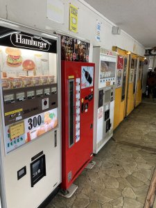 15年ほど前、栄華さんに私の地元のパチンコ店情報(お勧めは商店街にある木張りの昭和の雰囲気店)を提供させて頂いた際に、この「ダルマ」に興味を持たれましたね。このダルマは創業50年くらいであり、私が20代の時初めて車を購入した際のドライブの目的地にしてました。写真手前はハンバーガー、その右にビンの飲料、そしてラーメン、うどんの自販機が並びます。ラーメン300円です。
