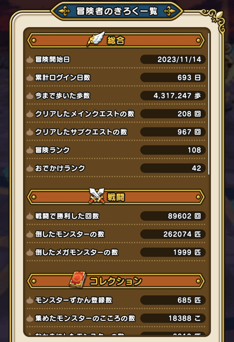DQWも6周年を過ぎて、なにかと環境も変わっておりますが、冒険を再開してから来月で丸2年になるらしいです。元々はリリース直後からスラミチ君と共に導かれていたんですが、iPhoneのバッテリー問題で辞めてしまって。。。こんな事なら、そのまま放置しとけば良かったぁぁ。今のアカウントの家の近所に前世の『キョウタケの家』が建っているんですが、いつまでデータが残ってんでしょうね?たまーに覗いて、もう手に入らない家具たちを愛でております。