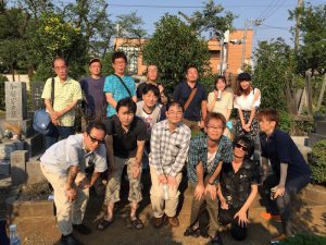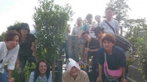 お墓を綺麗に掃除して、末井さんの献杯の音頭で缶ビールを飲み干し、しかる後に参加者がそれぞれ墓前で手を合わせて、最後に撮影したのが上の集合写真です。今回はいつものメンバーに加えてガル憎さん(パチスロ必勝ガイド)、しのけんさん(パチスロ攻略マガジン)、岡田ちほさん(パチンコ必勝ガイド)なども初参加されました。ここに写っているのはSNS等に顔出しOKの方々のみです。思いきり逆光で輝度調節を上げたため、なんだか白味を帯びた写真になっちゃいましたが、これはもう仕方がない。